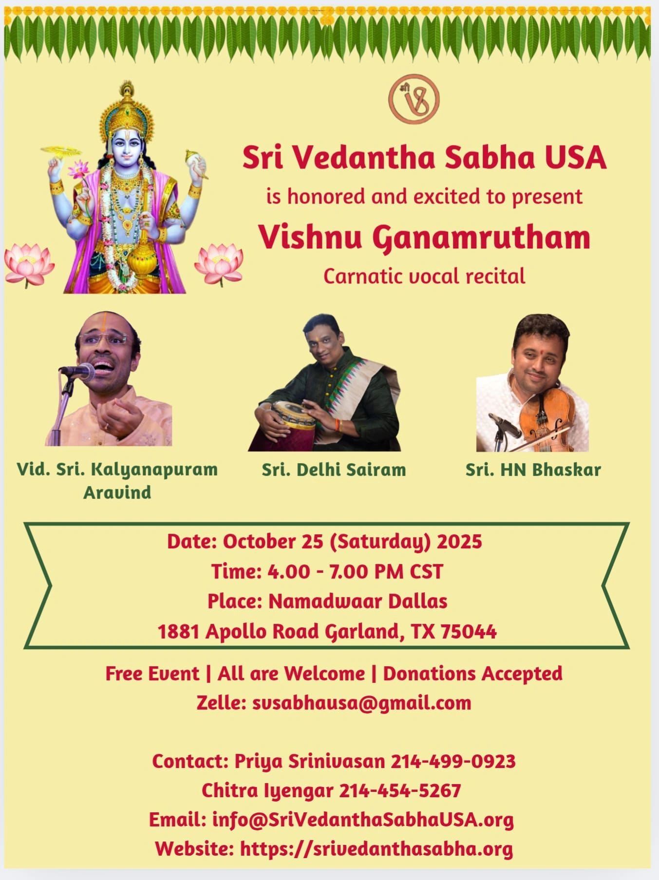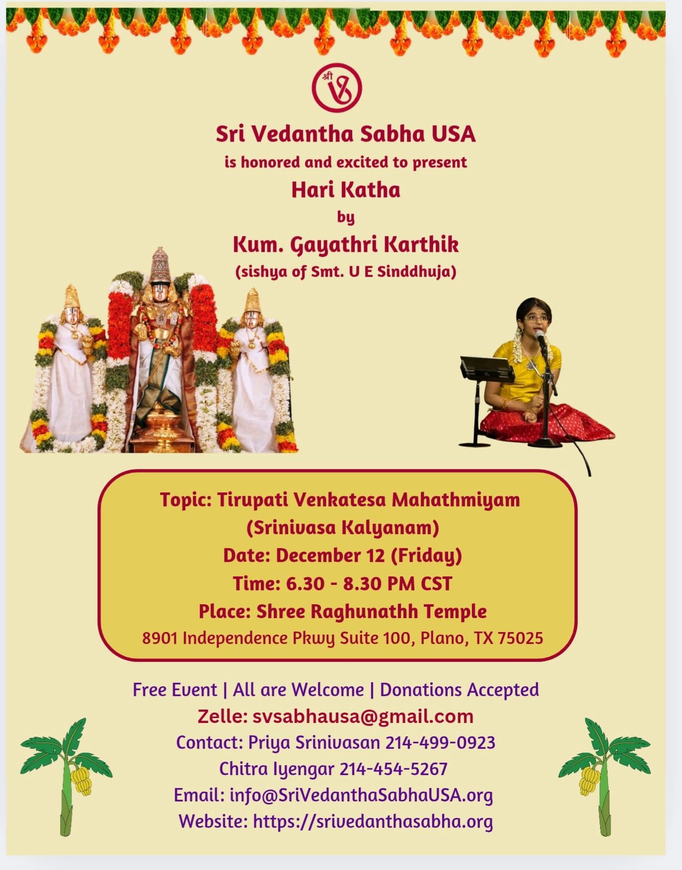 At Sri Vedantha Sabha USA, we follow the ancient wisdom of Sanatana Dharma and strive to live a life of dharma, karma, and moksha. Our goal is to preserve our culture for generations. We achieve this aim by sponsoring UpanyAsams (Discourses), spirituality based performances in the different arts found in the Sanatana Dharma and providing a platform for both International and Local USA artists.